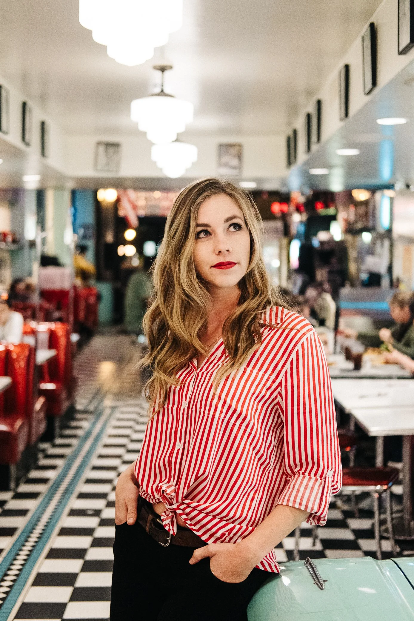 I’ve known Alex since college. We became friends in junior year and have stayed in touch even after graduation. Alex is one of the most creative, golden-hearted, and joyful people I know, and she has this classic natural beauty that I knew would be perfect for this concept. Now that we’re both working adults with busy schedules, not to mention living in different parts of the state, meeting up in person is difficult, but somehow we were able to make it work when she was on her way back home from a trip. This all came together on pretty short notice, which makes her outfit, hair and makeup even more impressive to me. As with all of my other shoots, there’s no professional stylist or HMUA involved, just the model doing everything herself. We shot in a diner and outside a movie theater.